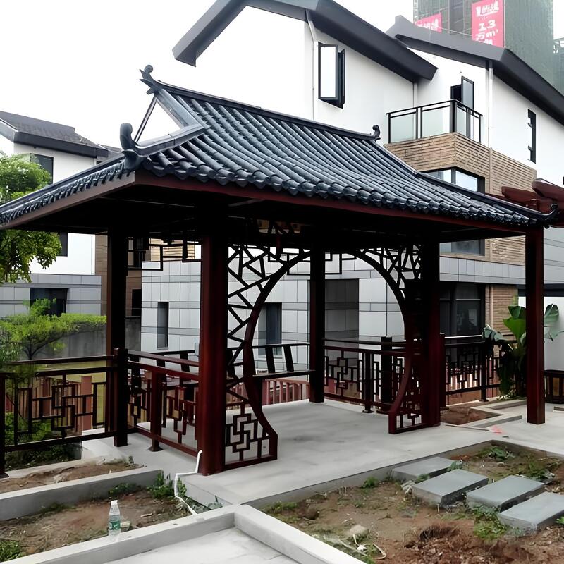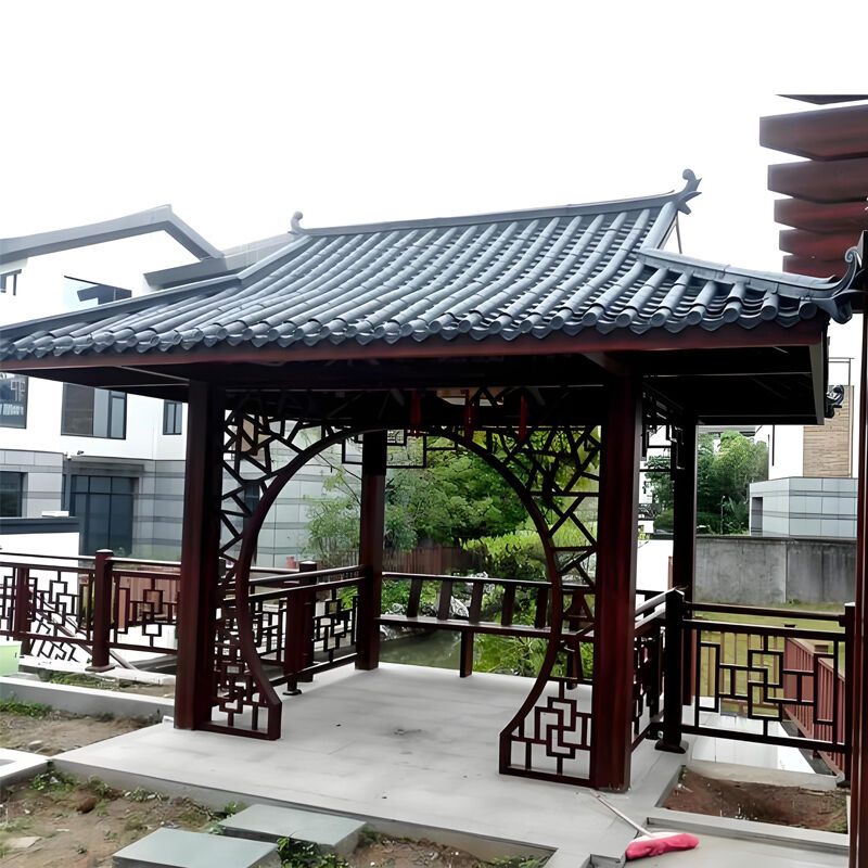 Authentic Chinese Overhang Design:Özel eğri silueti, katmanlı katmanları,and decorative ridge details of traditional Chinese roof eaves"instantly recognizable elements of classical oriental architecture" (Klasik Doğu mimarisinin aniden tanınabilir öğeleri).